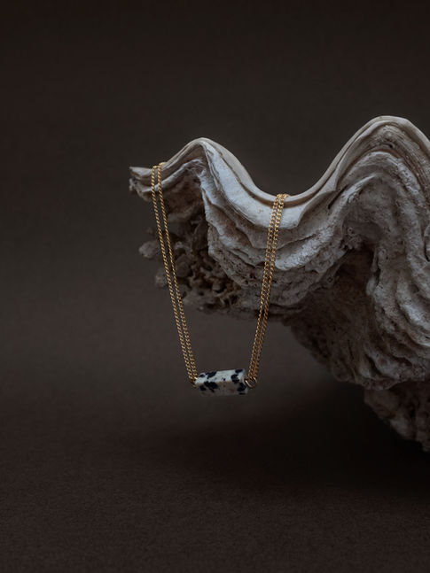 Deux chaînettes dorées qui dessinent une ligne fine et mouvante autour du cou, ponctuées d’une pierre fine. Néri se porte comme un talisman, élégant et personnel.